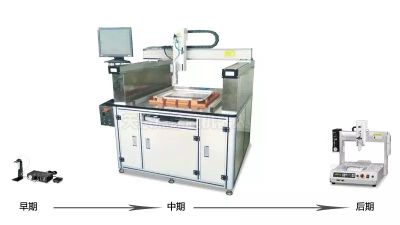 最早期的点胶机,只是一个控制流体出胶量的控制系统。后来发现人工手持这种设备,虽然出胶量可以控制了,但出胶没有一致性,而且还不美观。人工要达到这一效果,要经历很长一段时间的磨练,这对生产无疑是不利的一面。经过研发人员不断的摸索与研究,开发出控胶系统与自动化设备相结合的新型设备。在早期这种设备的外形还很庞大,得不到有效的推广,原因有很多,第一,他的造价很高;第二,外形太大,不好移动;第三,开发机器的周期较长。为了再次适应市场需求,又继续研发,千锤百炼之后,就得到了我们目前市场上的标准点胶机了,机形小巧,功能灵活搭载,造价相比之前降低了很多。
